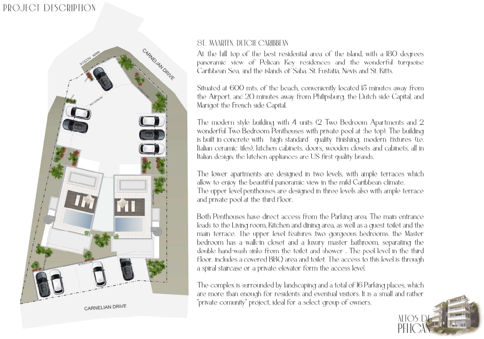 One lot consisting of 806m2 including a Building Permit for Two Buildings with Four total units consisting of Two 2–bedroom units and Two 2–bedroom penthouses located at the hill top of the best residential area of the island, with a 180 degrees panoramic view of Pelican Key residences and the wonderful turquoise Caribbean Sea, and the islands of Saba, St. Eustatius, Nevis and St. Kitts.