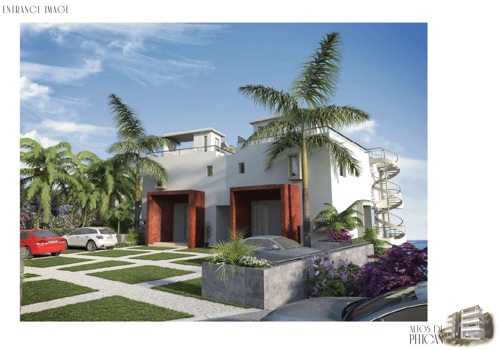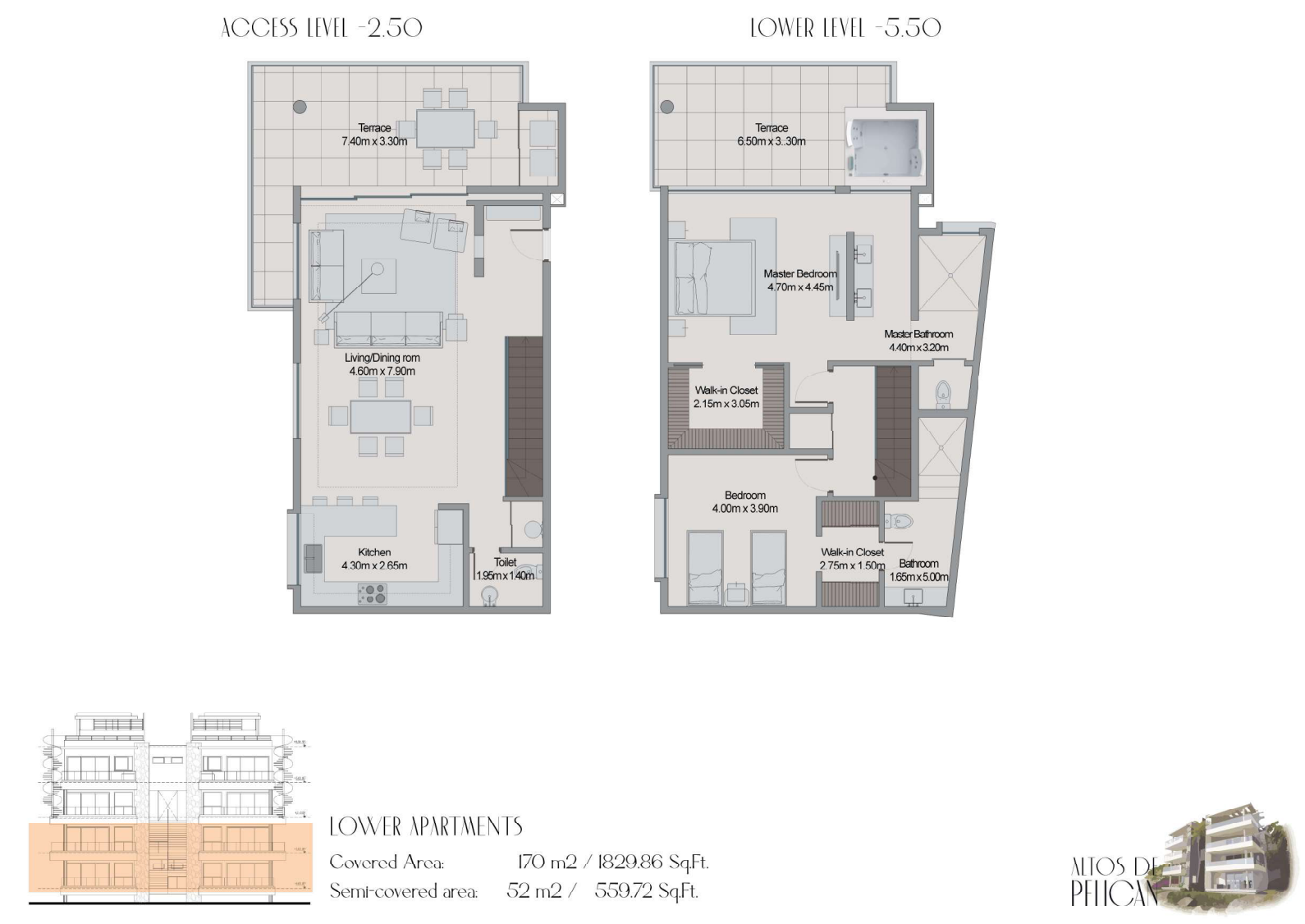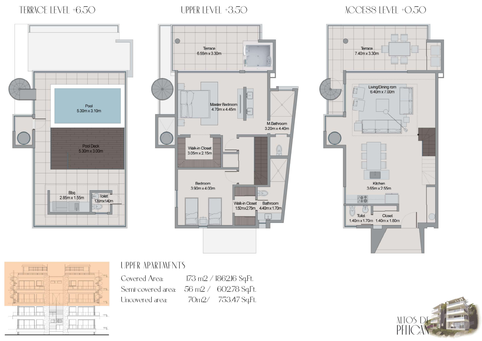 Both Penthouses have direct access from the Parking area. The main entrance leads to the Living room, Kitchen and dining area, as well as a guest toilet and the main terrace. The upper level features two gorgeous bedrooms. the Master bedroom has a walk–in closet and a luxury master bathroom, separating the double hand–wash sinks from the toilet and shower. The pool level in the third floor, includes a covered BBQ area and toilet. The access to this level is through a spiral staircase or a private elevator form the access level.