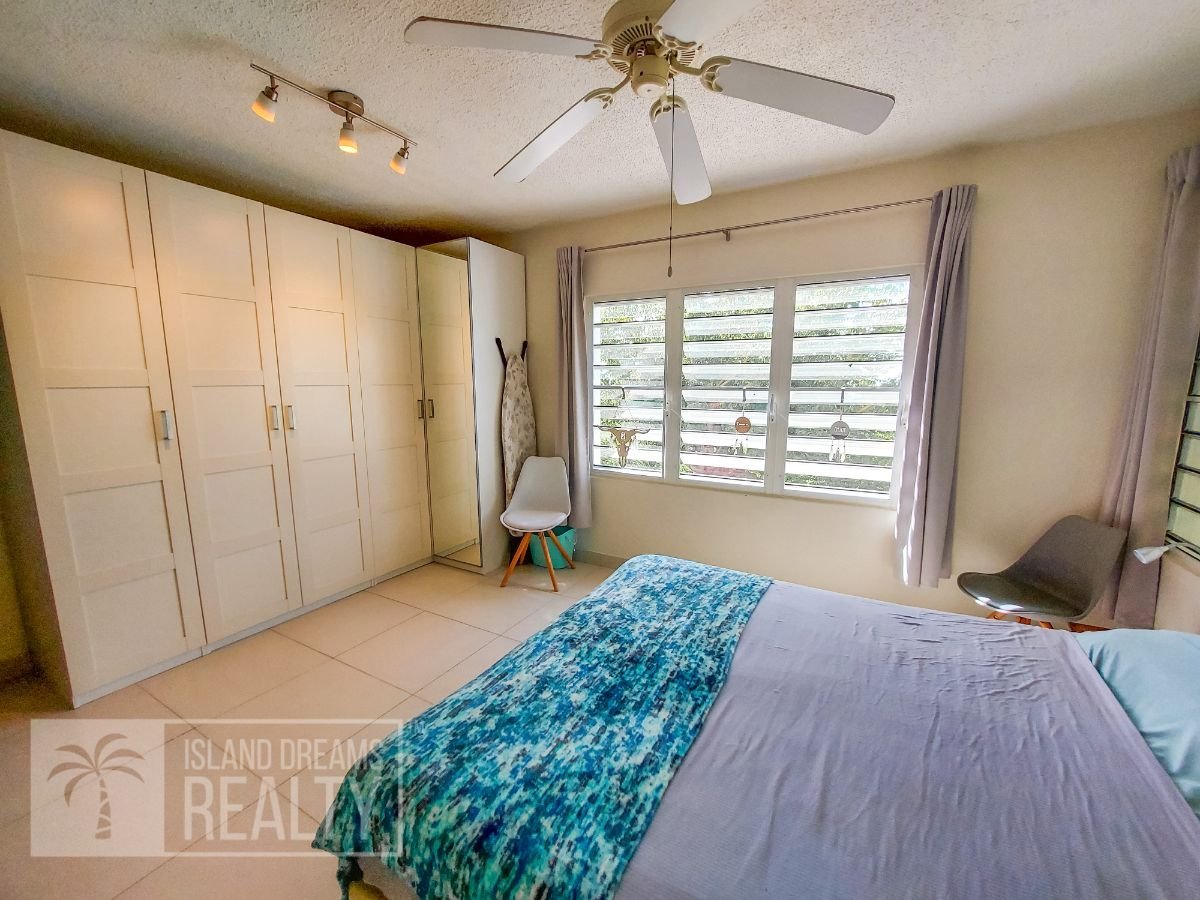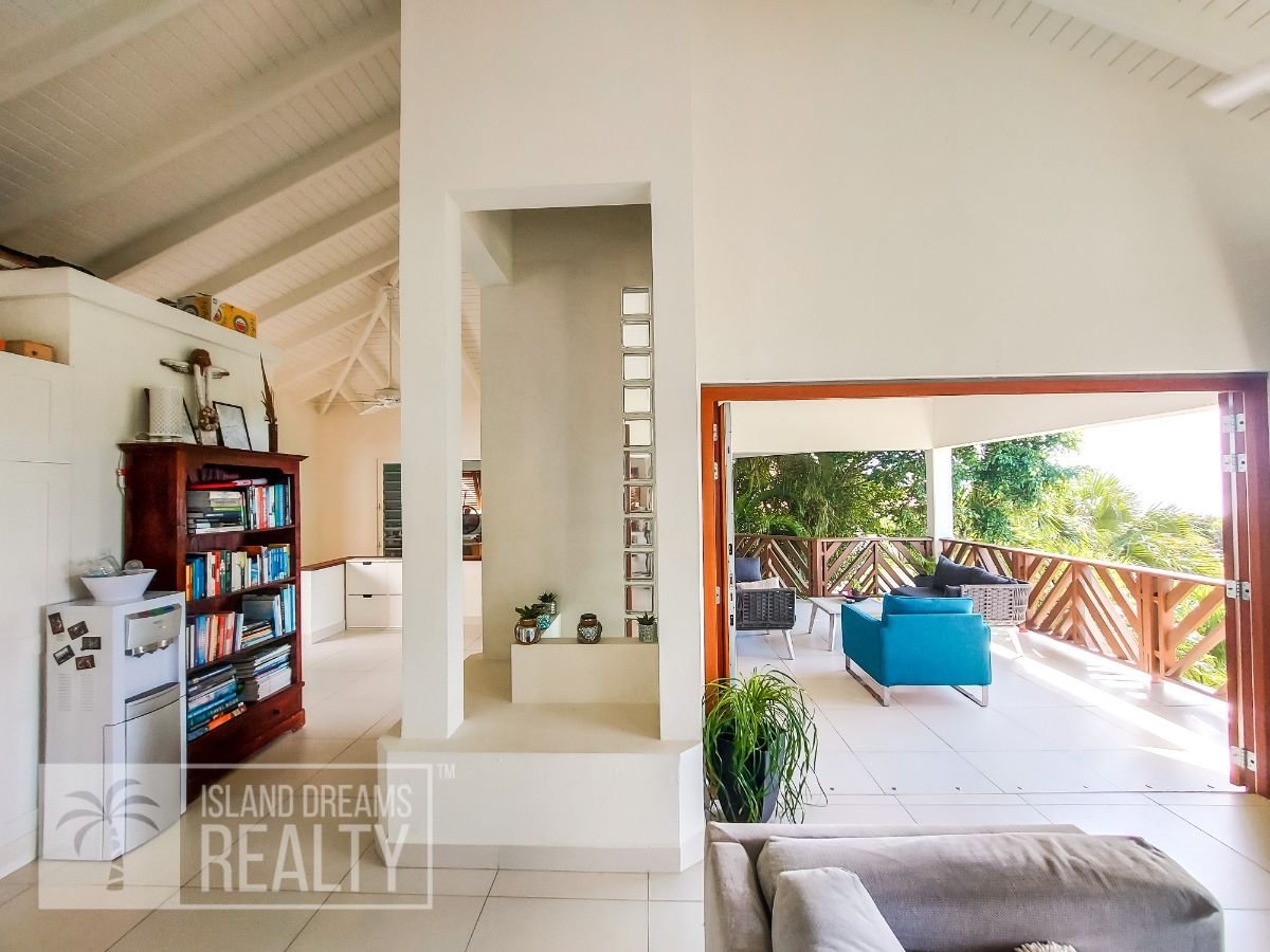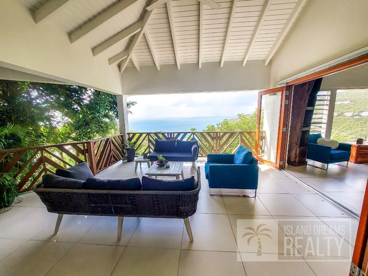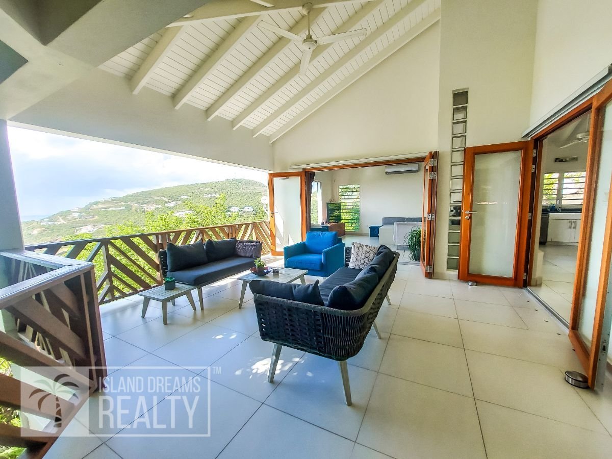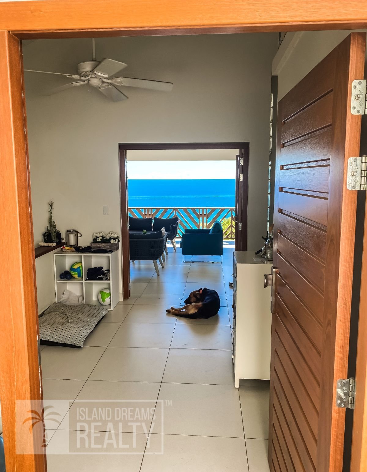 This 3-bedroom, 2 full bathroom villa has many windows giving it lots of natural light and a constant flow of tropical breeze throughout the villa. The villa also features large balcony doors that lead you straight onto the large balcony, creating a huge indoor/outdoor living space with spectacular views of the ocean and neighboring islands.