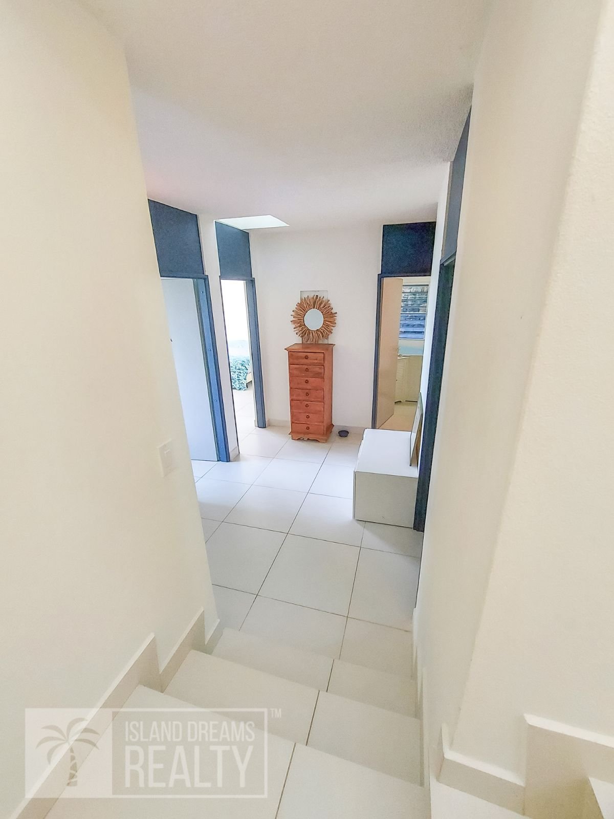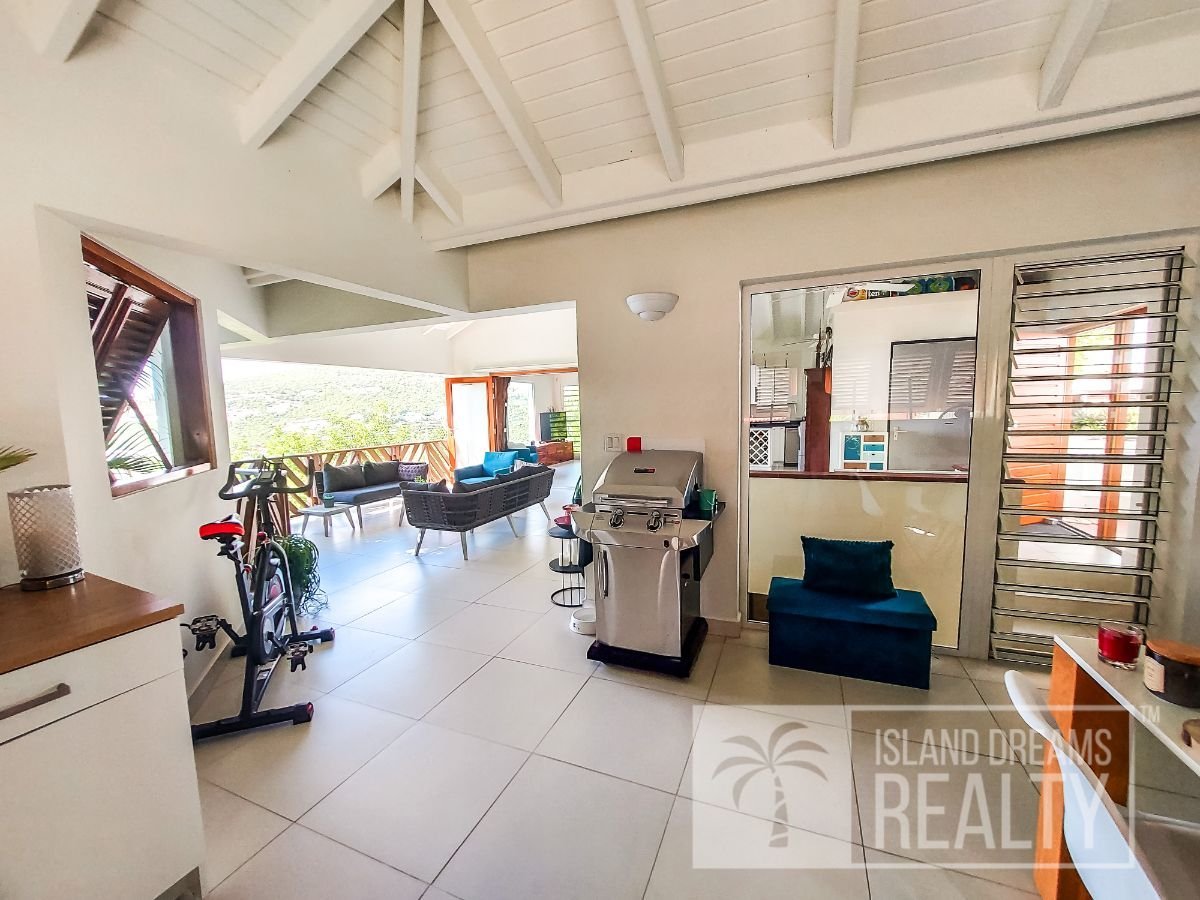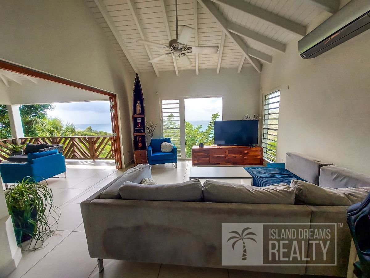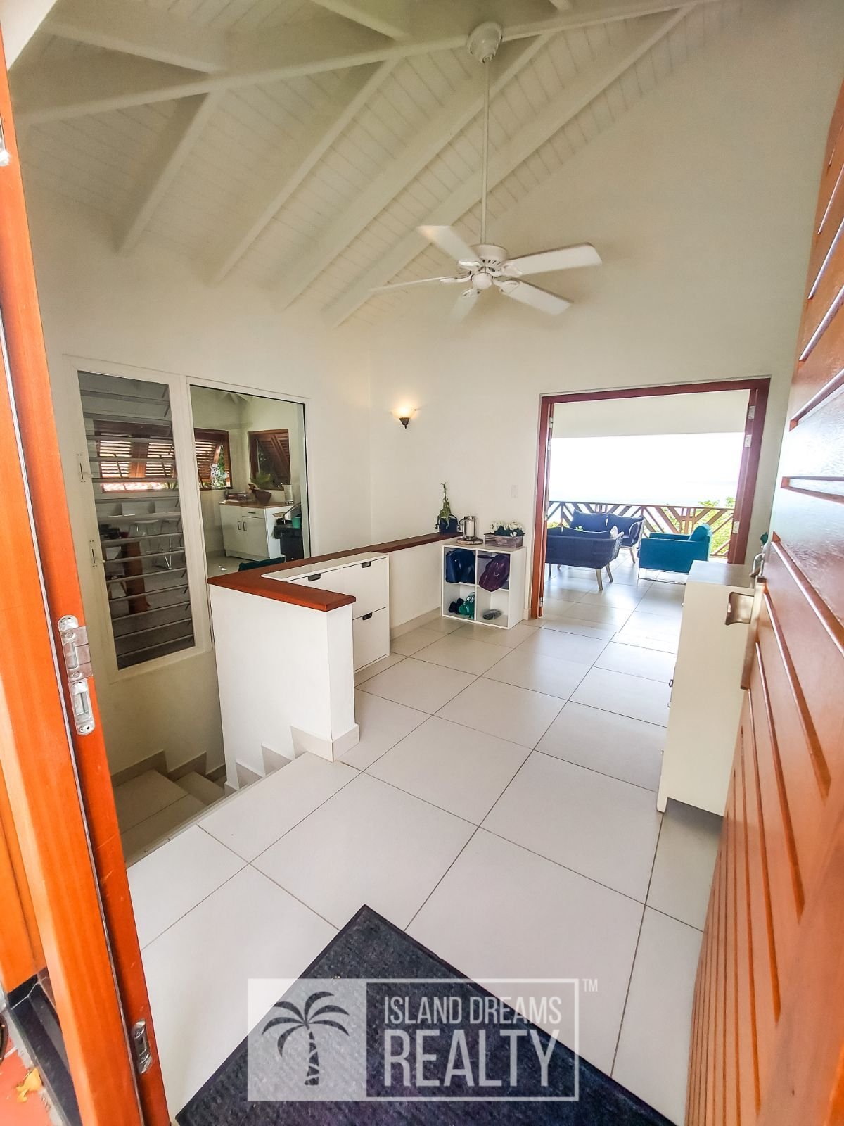 This 3-bedroom, 2 full bathroom villa has many windows giving it lots of natural light and a constant flow of tropical breeze throughout the villa. The villa also features large balcony doors that lead you straight onto the large balcony, creating a huge indoor/outdoor living space with spectacular views of the ocean and neighboring islands.