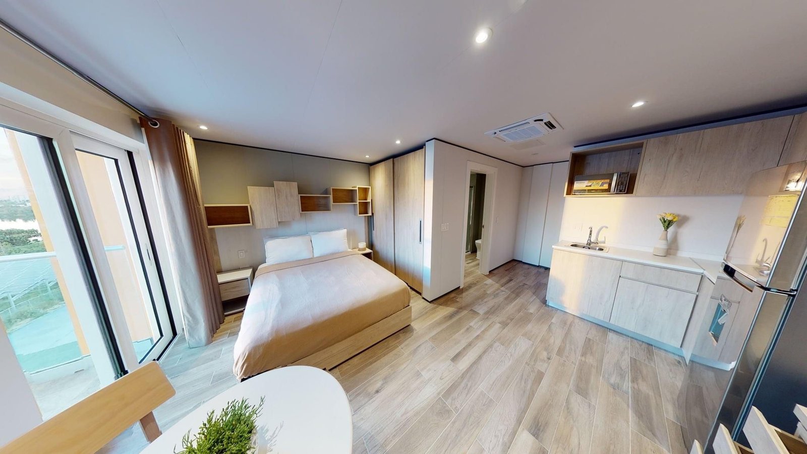 This unit measures at about 30m2 and comes fully furnished, including a full kitchen corner, a good-sized full bathroom and a queen sized bed with built-in shelving above the bed and night stands. Next to the bed there is a sliding door leading to the cozy balcony. The unit also includes an ergonomically designed work/study space with a flat screen tv, desk and built in shelving. All furniture uses fine woods and fixtures.