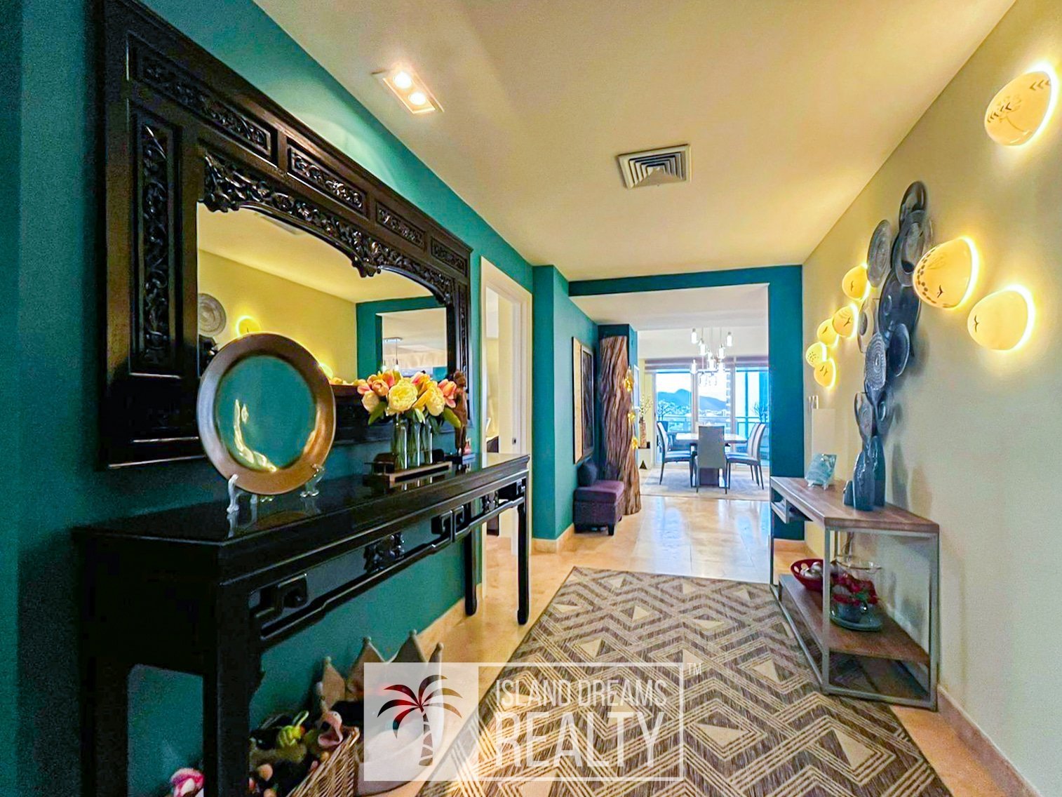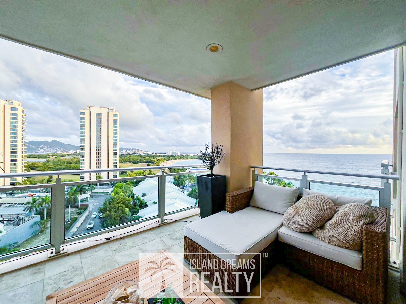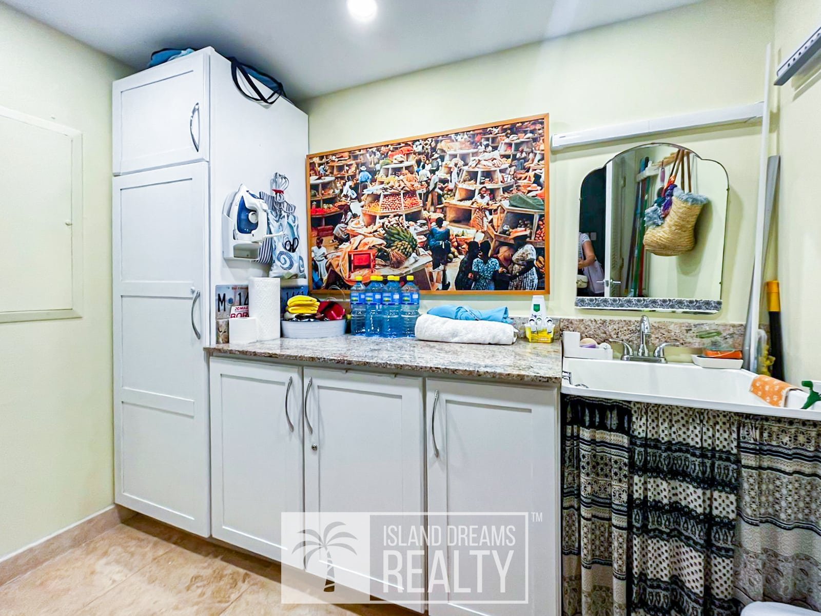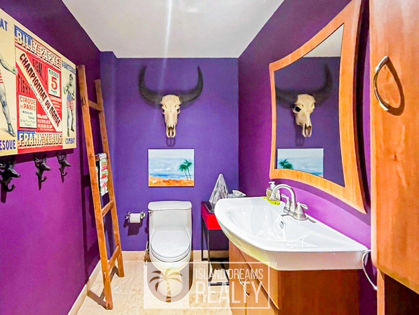 The living area and porch enjoy a south-east exposure, capturing gentle morning light, cooling breezes, and a serene sense of openness throughout the day. Inside, the residence feels immediately welcoming, defined by vivid colors and a distinctly homey elegance that softens its upscale design. Both bedrooms are impressively spacious, while the primary suite commands a breathtaking 180-degree ocean view, an uninterrupted panorama that defines coastal Caribbean living at its finest.