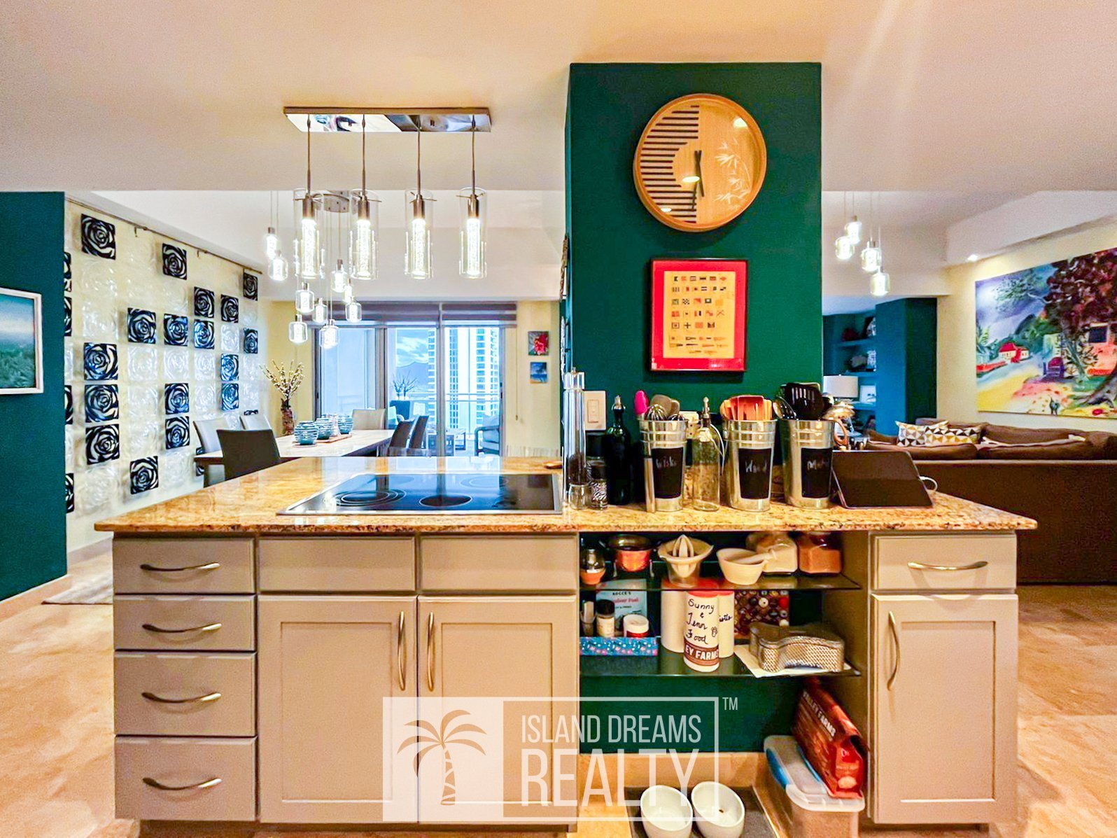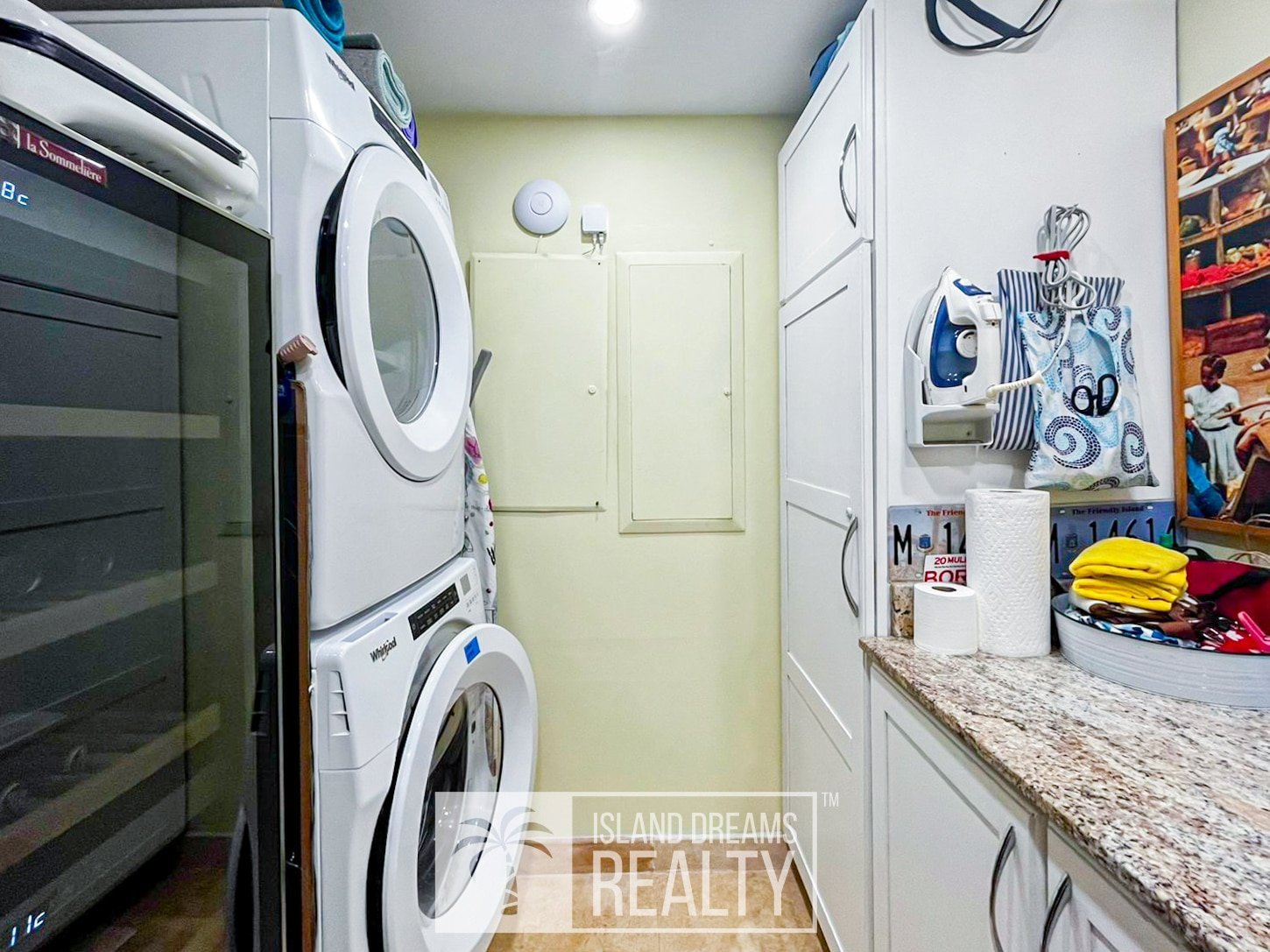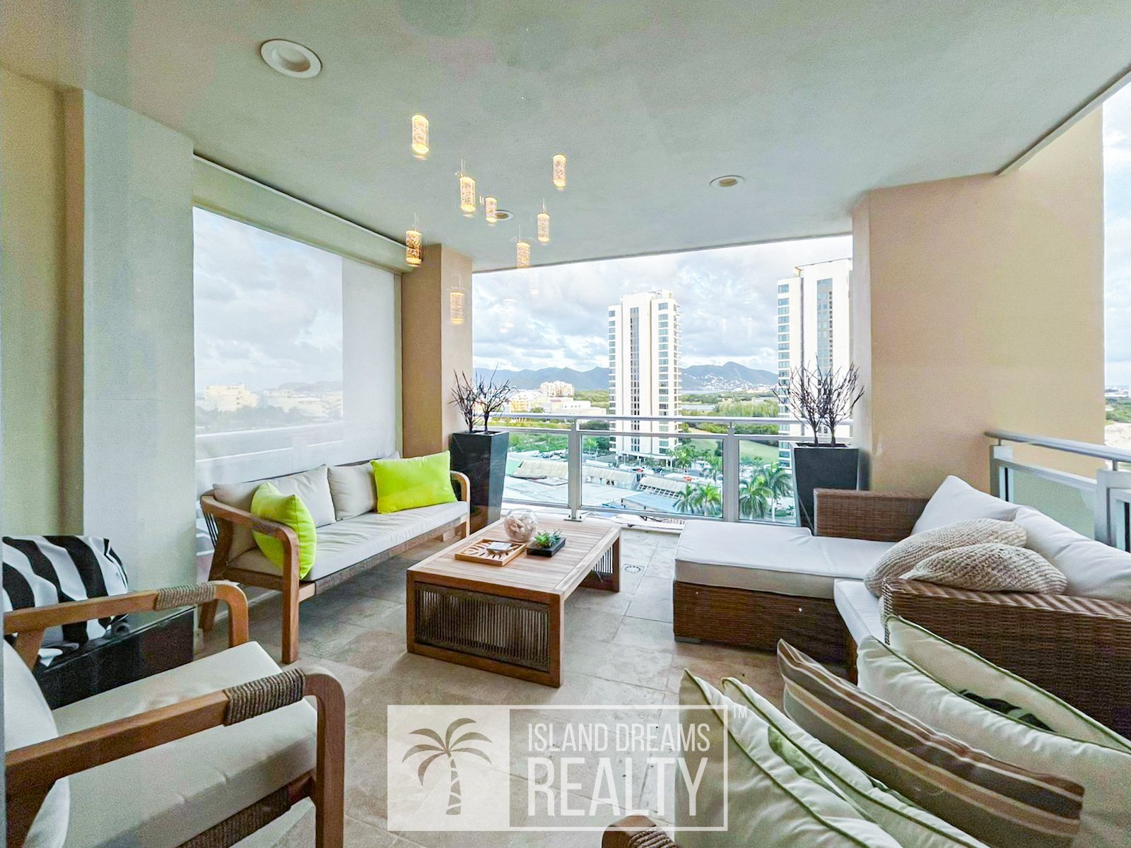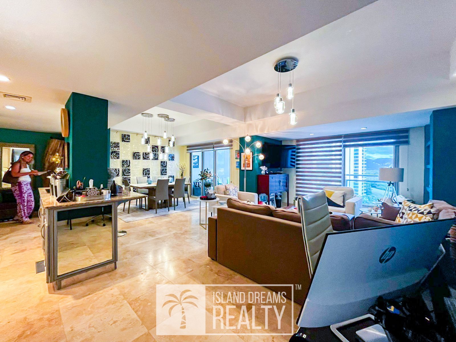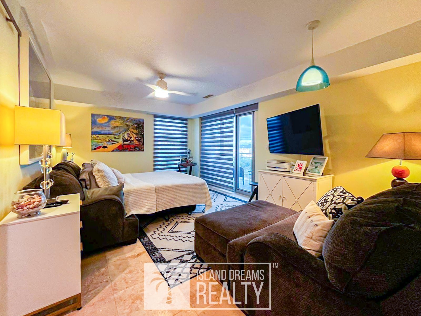 The living area and porch enjoy a south-east exposure, capturing gentle morning light, cooling breezes, and a serene sense of openness throughout the day. Inside, the residence feels immediately welcoming, defined by vivid colors and a distinctly homey elegance that softens its upscale design. Both bedrooms are impressively spacious, while the primary suite commands a breathtaking 180-degree ocean view, an uninterrupted panorama that defines coastal Caribbean living at its finest.