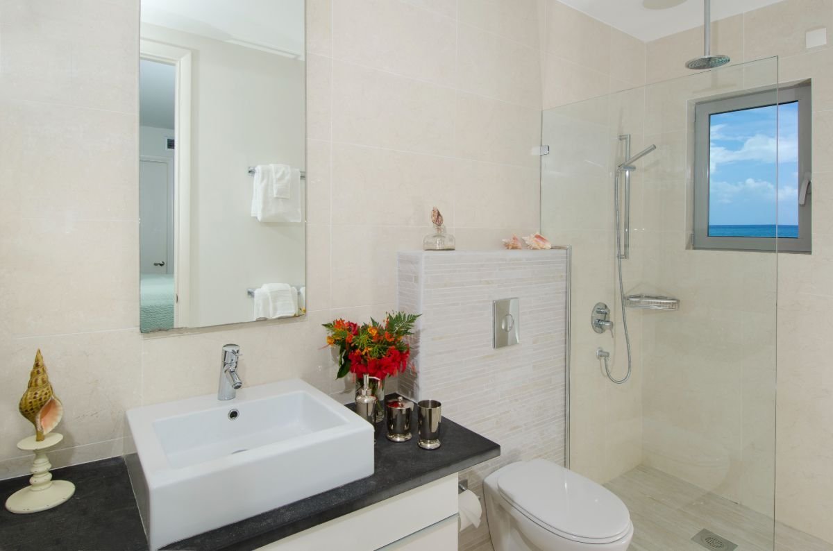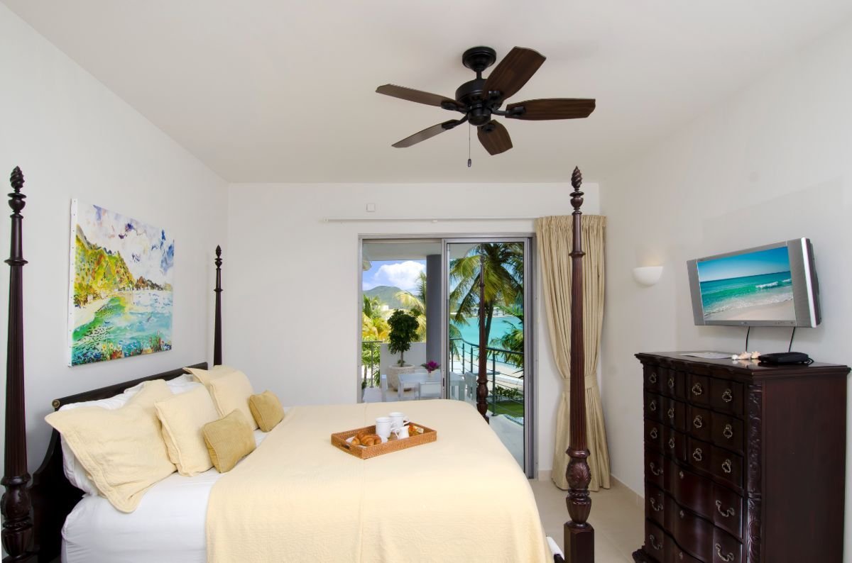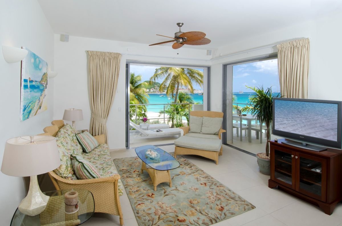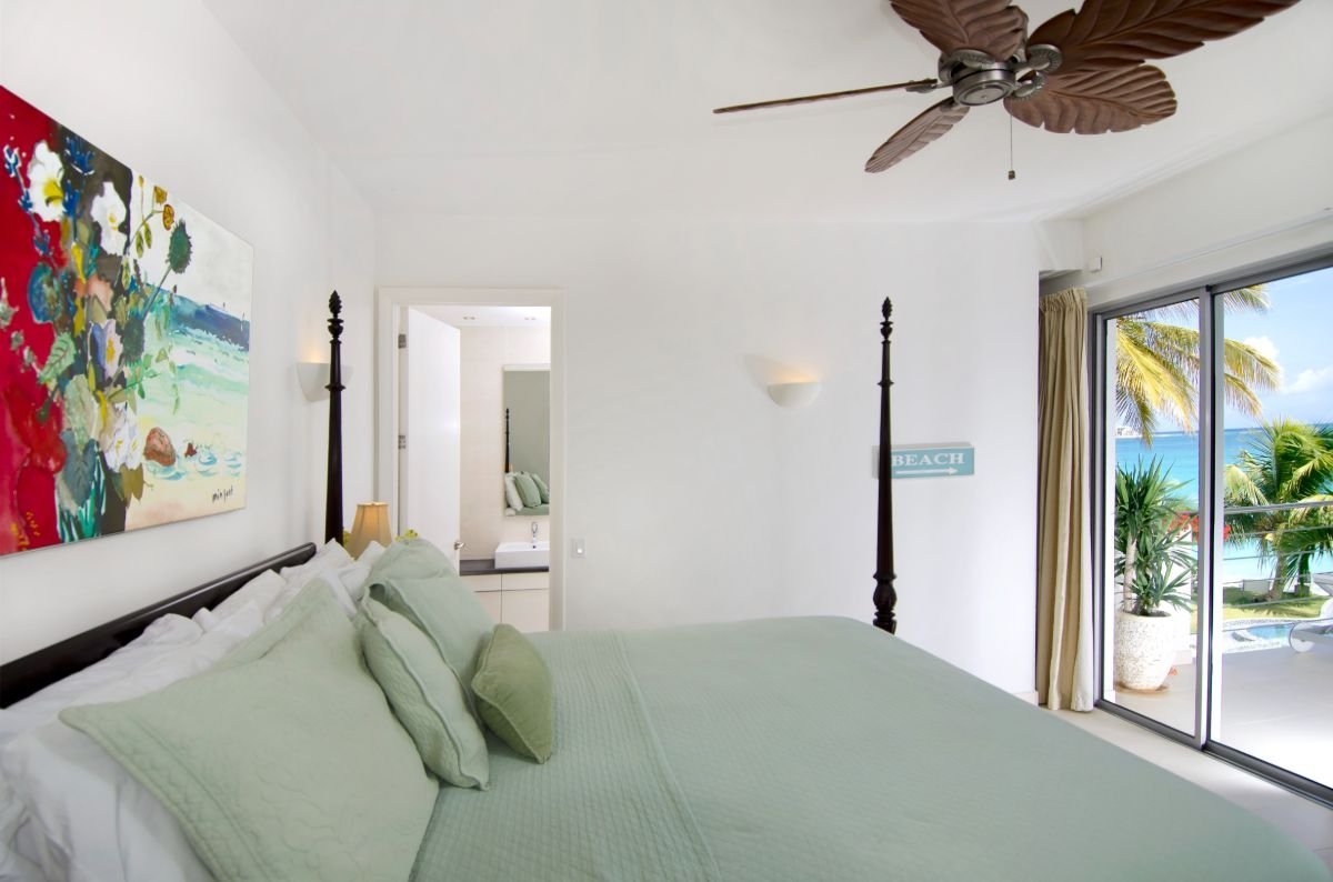 Each of the two master beachfront bedrooms and large living area offers spectacular direct views of the cerulean Caribbean and Isle of Saba.