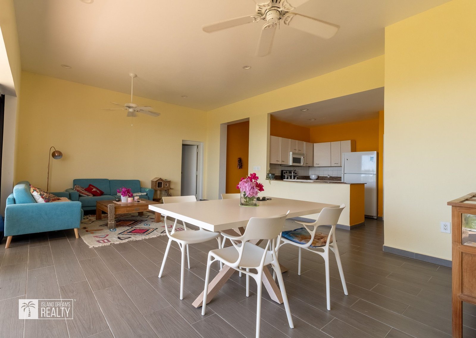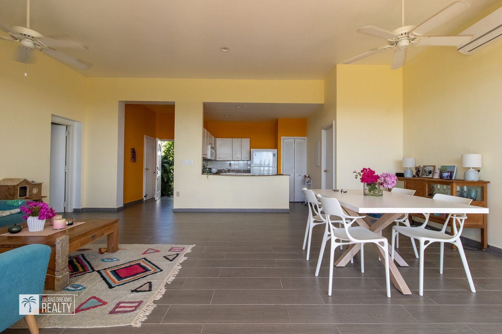 Saving the best for last, we have the spacious terrace connected directly to the common pool of this 13-unit, pet friendly complex. The terrace is partially tiled and partially garden, offering a space with plenty of opportunities to read your favorite book in the cozy lounge area or catch some rays of sun while you picnic on the grass. You can cool off afterwards in the large swimming pool with unobstructed views of different shades of Caribbean blue waters and sky…