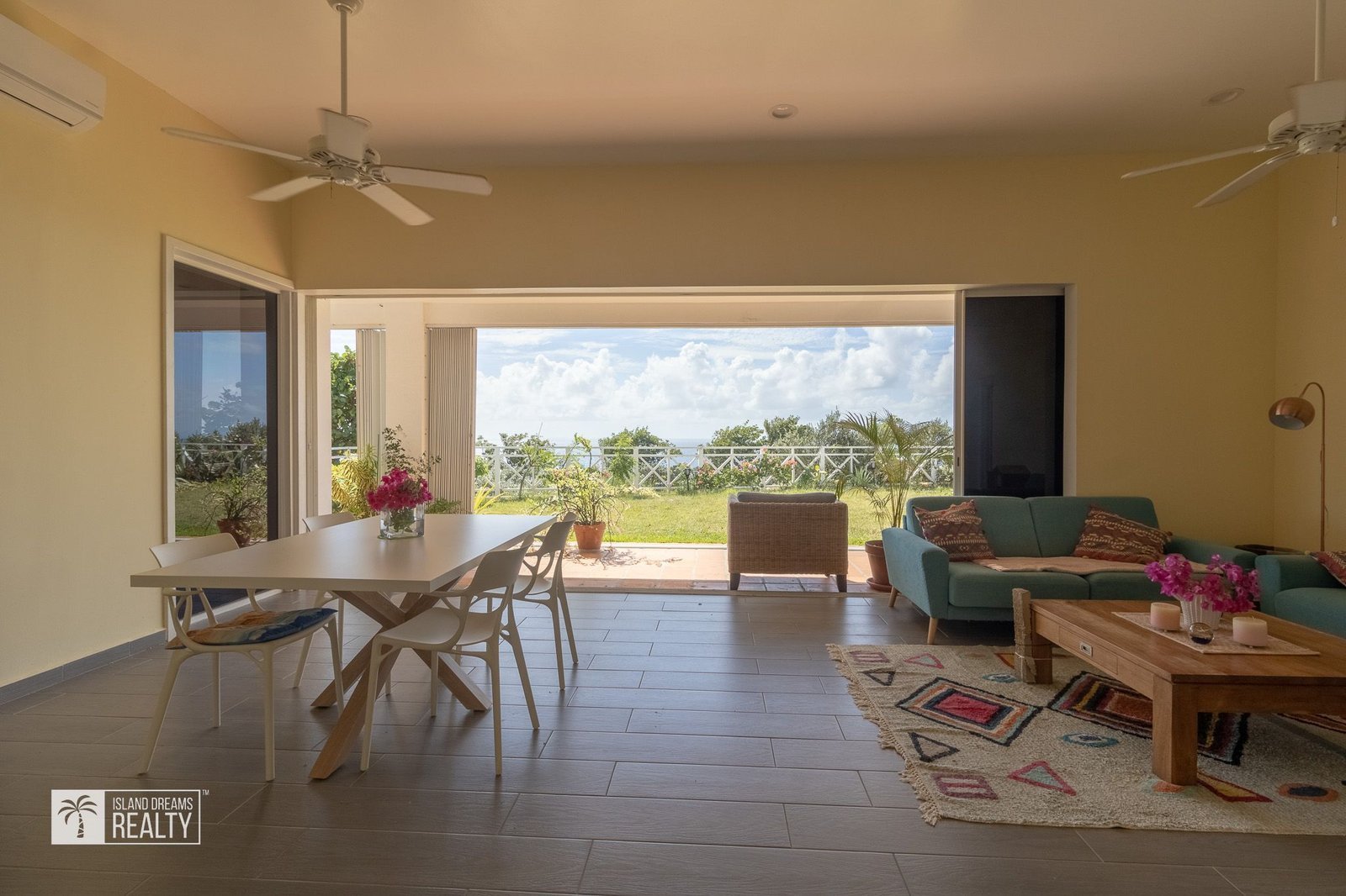 Upon entry you’ll be blown away by the beautiful ocean views transpiring through the large sliding doors. Tinted glass offers a cool shade inside the spacious living room with an open floor concept to the kitchen. One of bedrooms in the main house also has a sliding door leading directly to the terrace.