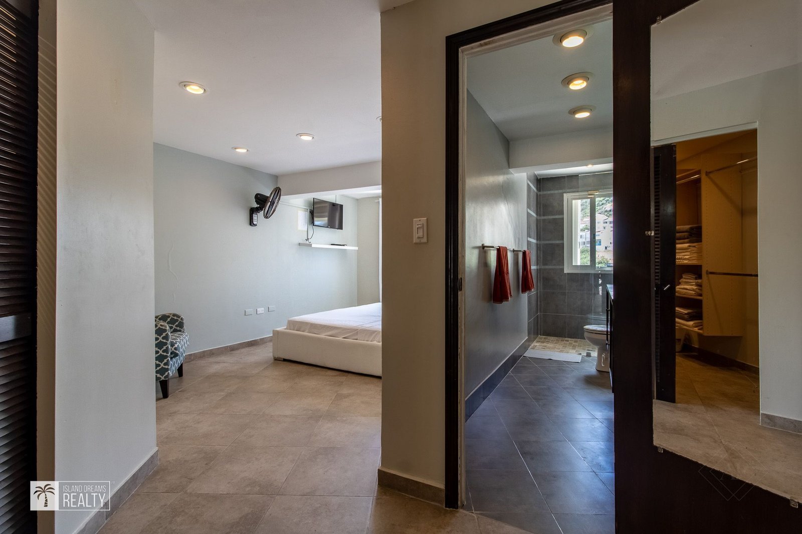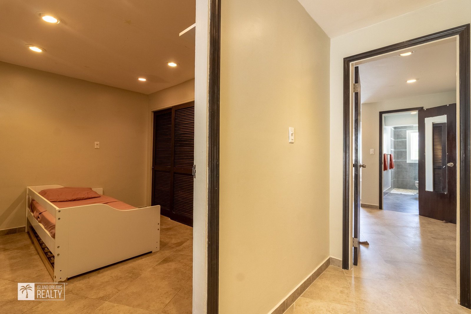 Upstairs, you’ll find the first bedroom which is a cozy one with lots of built-in closet space and an ensuite bathroom. It is the perfect size to function as a kids room or as a guest bedroom.