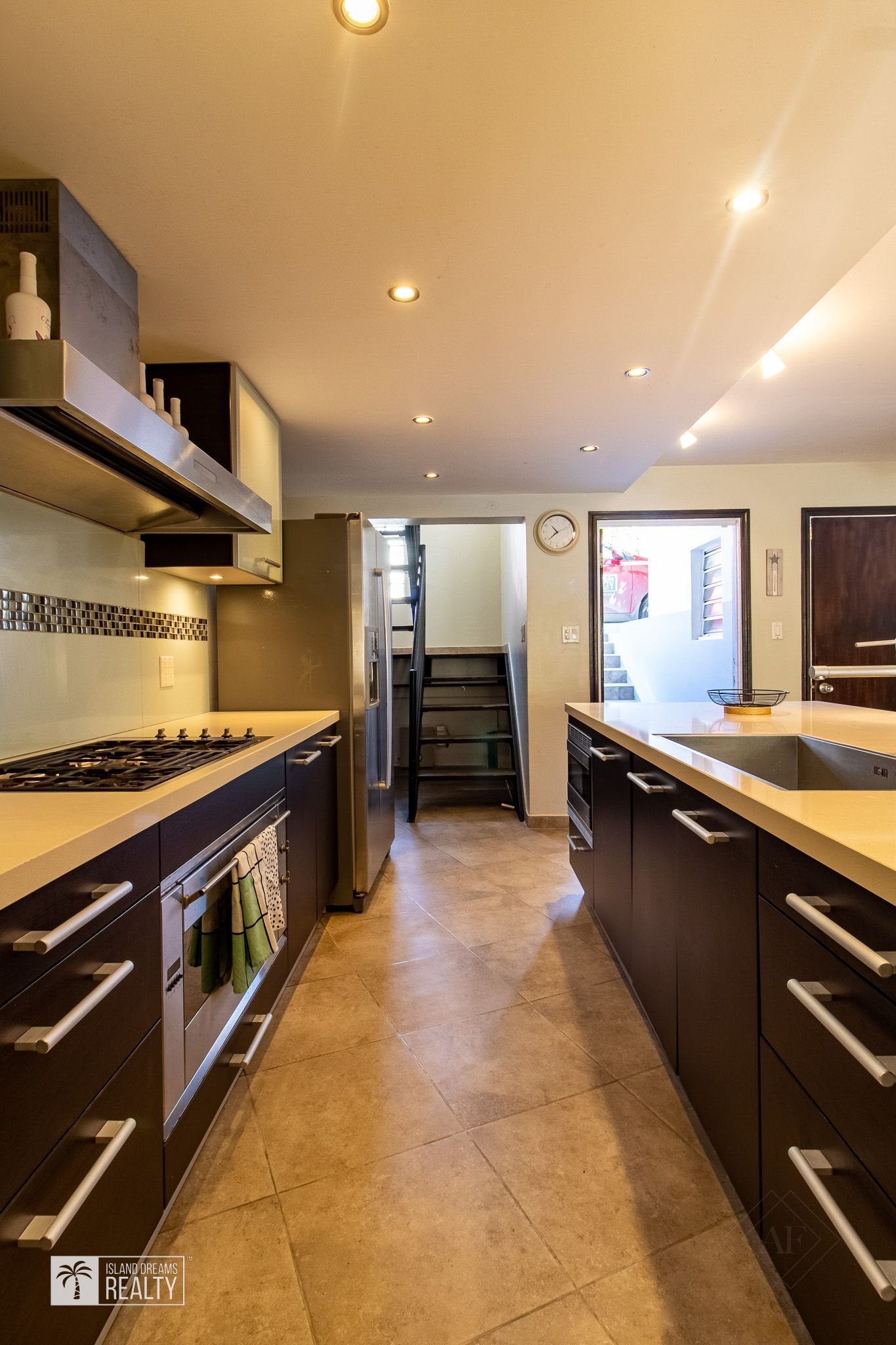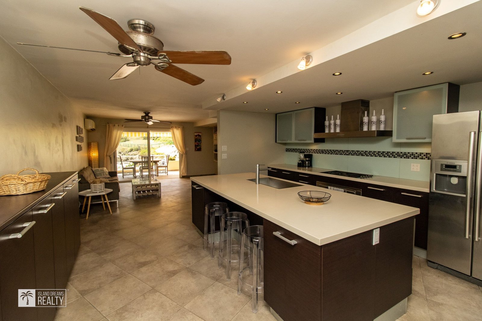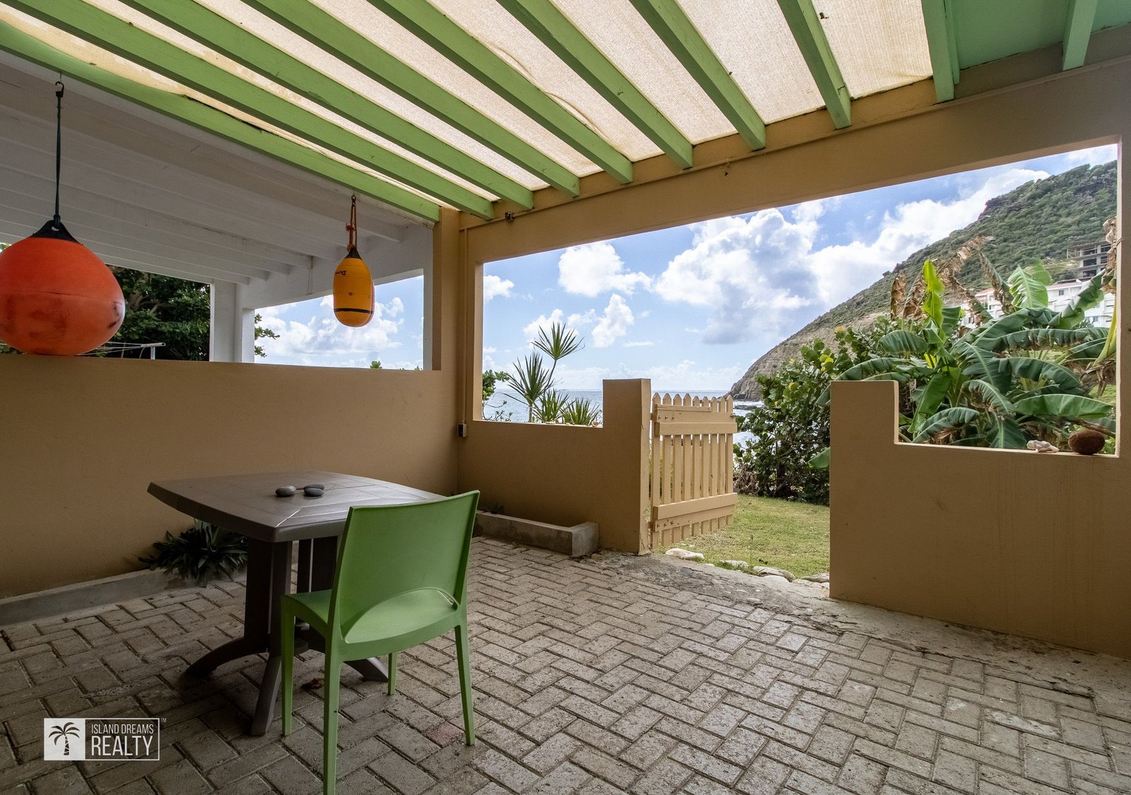 The main house has 2 bedrooms with ensuite bathrooms upstairs and a modern kitchen, living room and balcony overlooking the beautiful ocean on the ground floor. The kitchen has a large island with a bar and is equipped with Bosch stainless steel appliances and an electric stove. Near the kitchen is a half-bath with a washer and dryer.