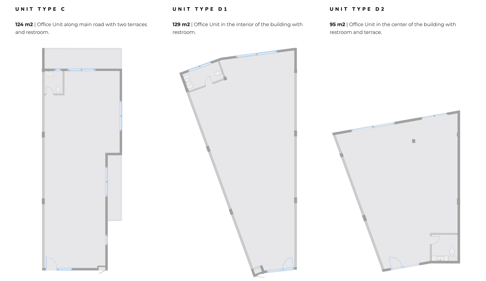 Unit Type Size Price Key Features Unit Type C 124 m² Starting from $383,000 Office unit with private bathroom and 2 terraces (18 m²). Type D1-A 129 m² Starting from $374,000 With terrace (9 m²). Type D1-B 129 m² Starting from $379,000 Without terrace (larger interior). Type D2 95 m² Starting from $318,000 Unit is in the center of the building ✨ Building Features: