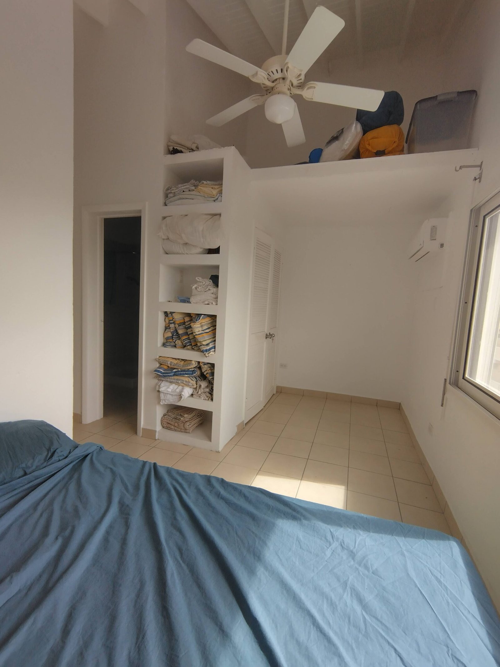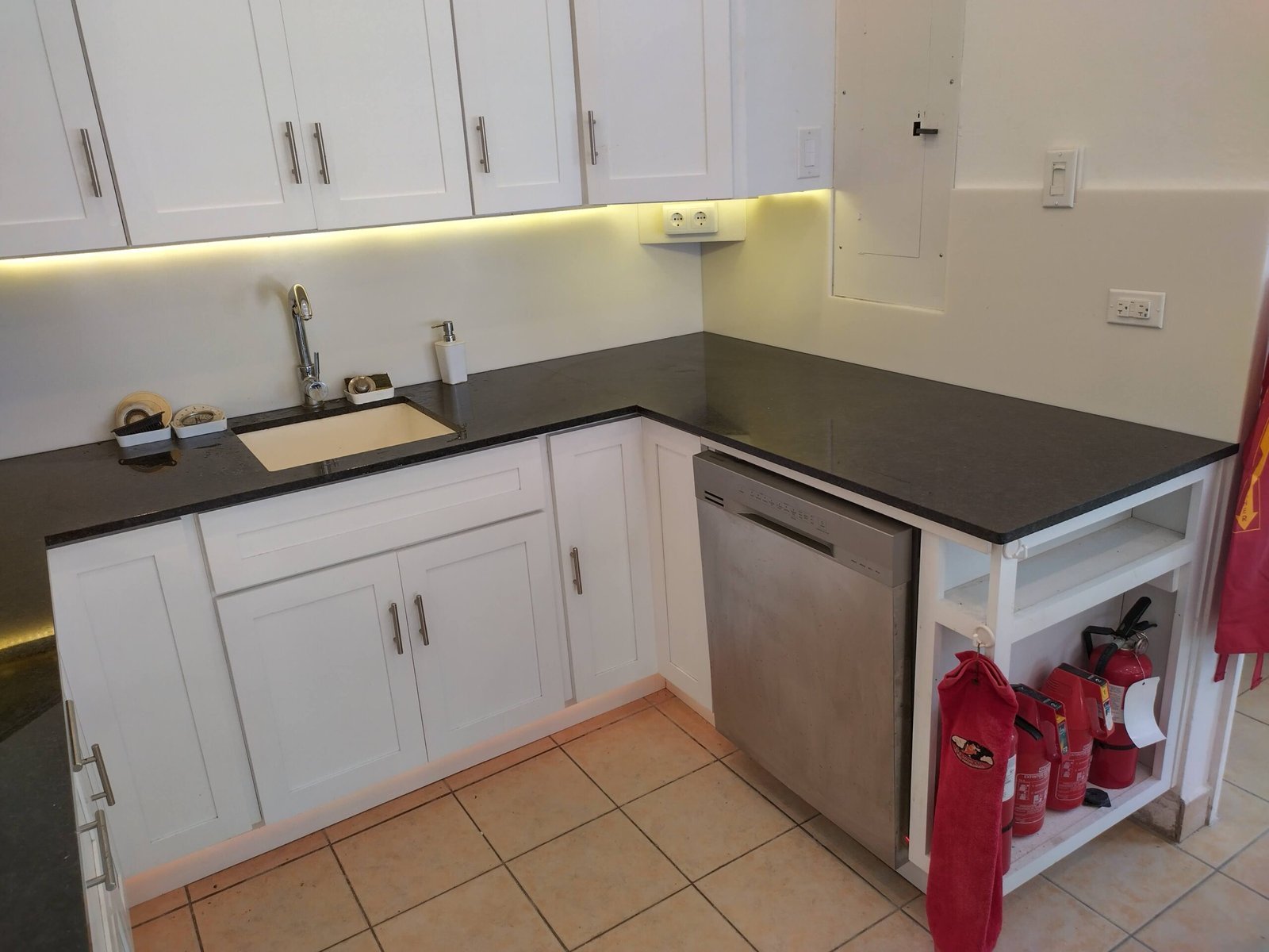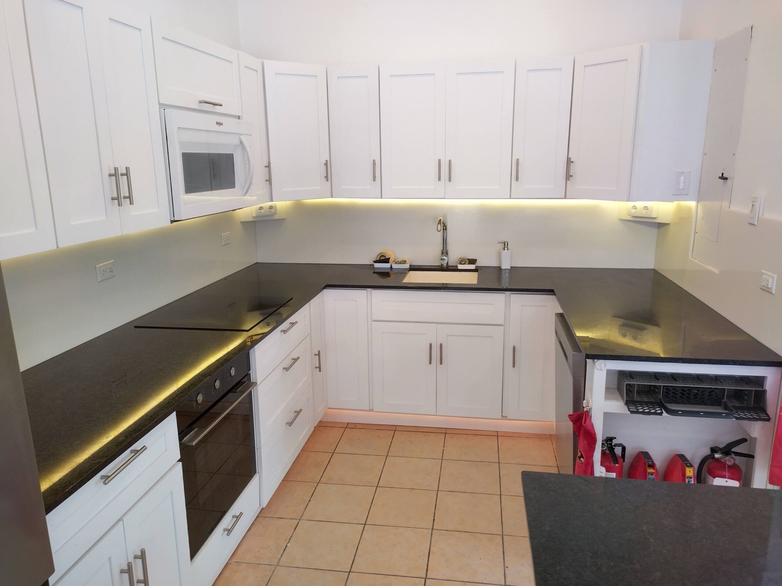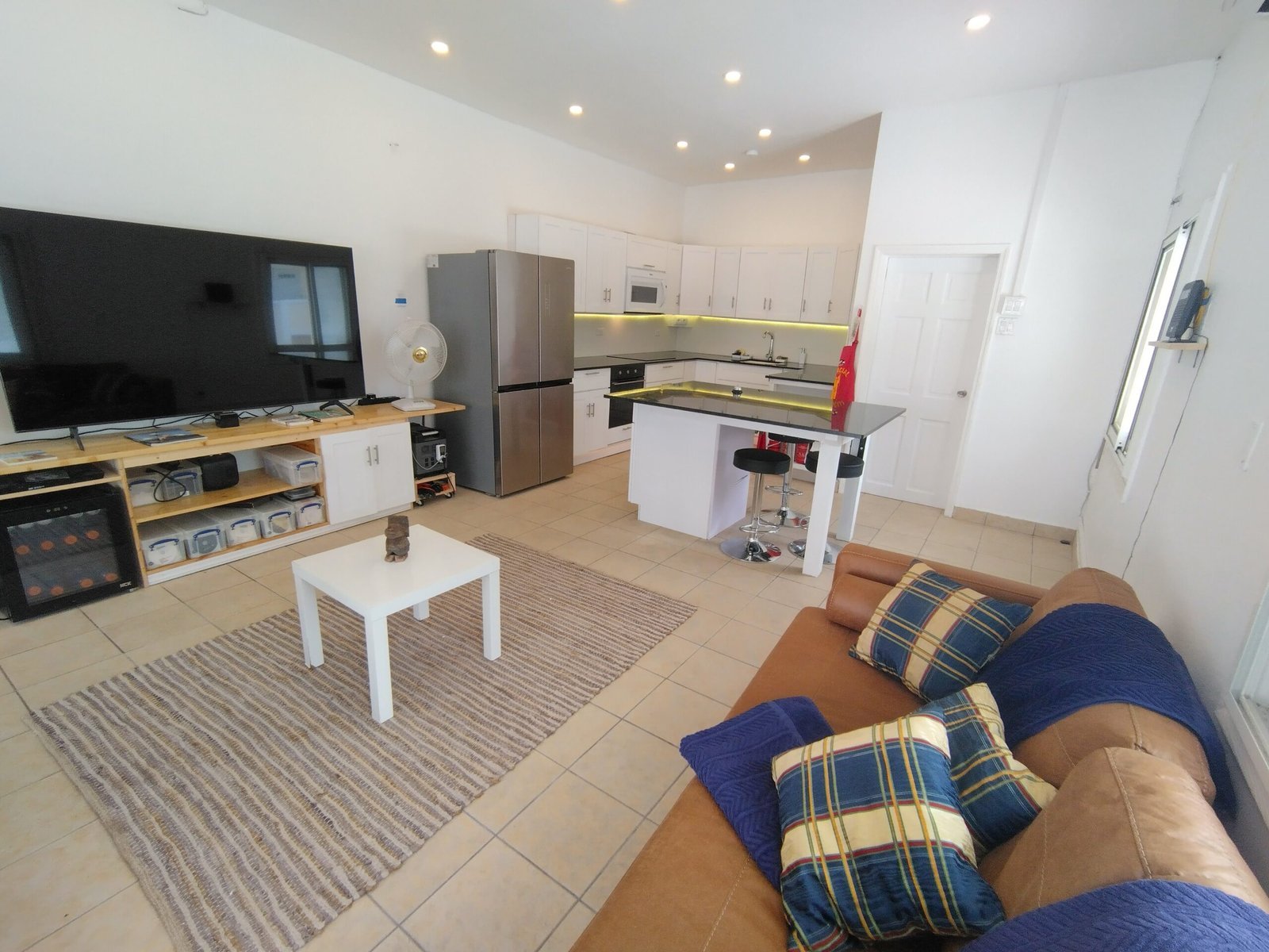 The living room is spacious and inviting, with plenty of natural light and comfort. It comes equipped with a new 75” TV, a custom bar with various glasses, a custom foldable desk, mini fridge, hurricane shutters and air conditioning.