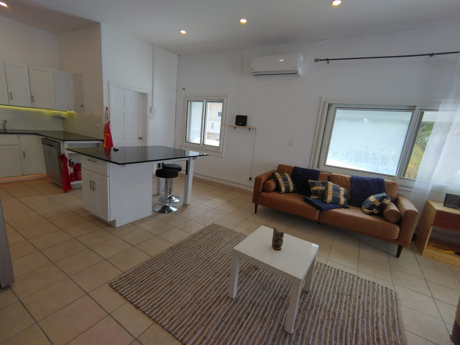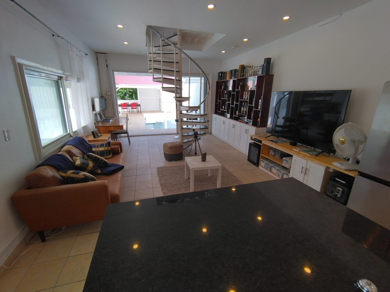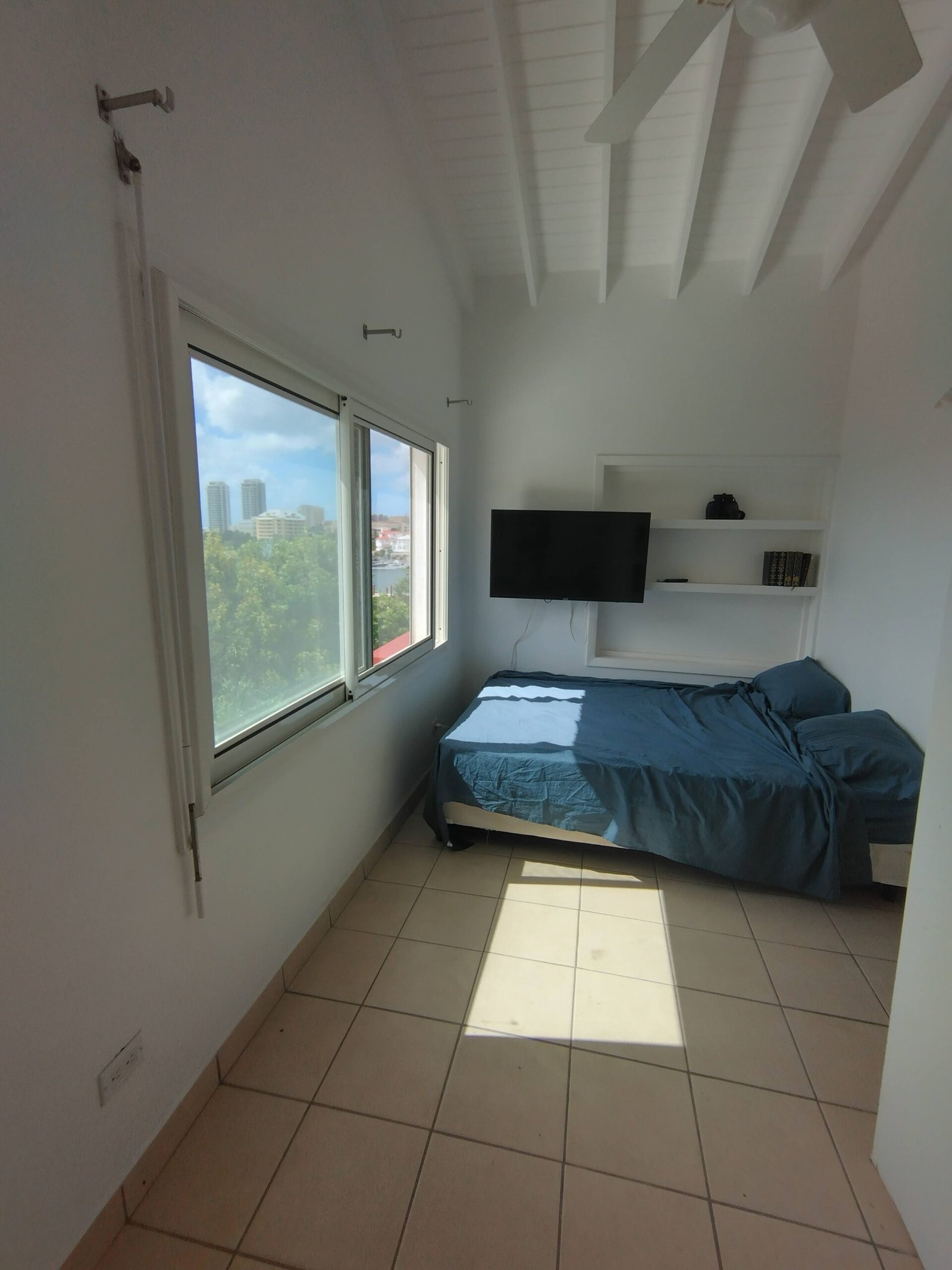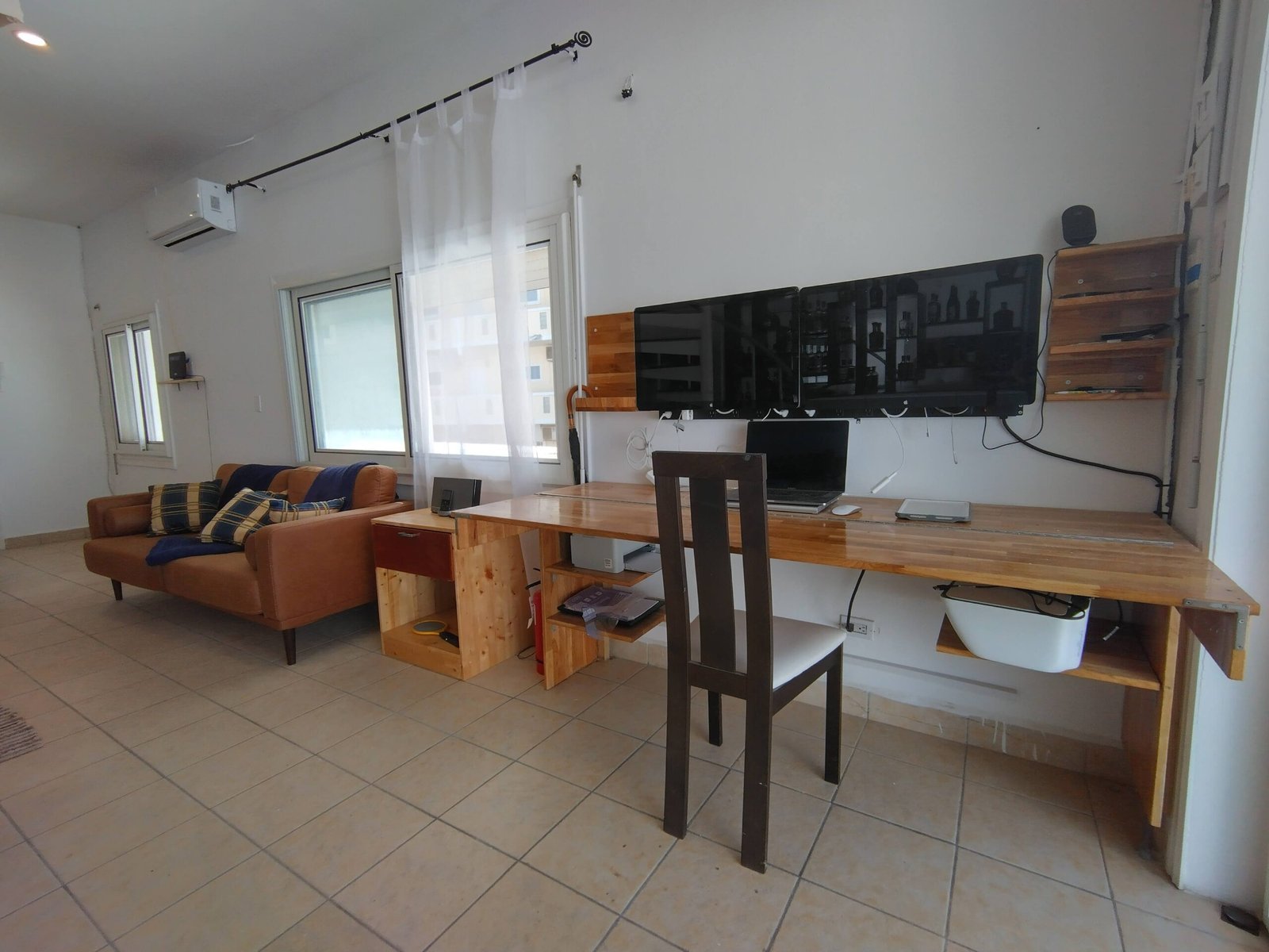 The living room is spacious and inviting, with plenty of natural light and comfort. It comes equipped with a new 75” TV, a custom bar with various glasses, a custom foldable desk, mini fridge, hurricane shutters and air conditioning.