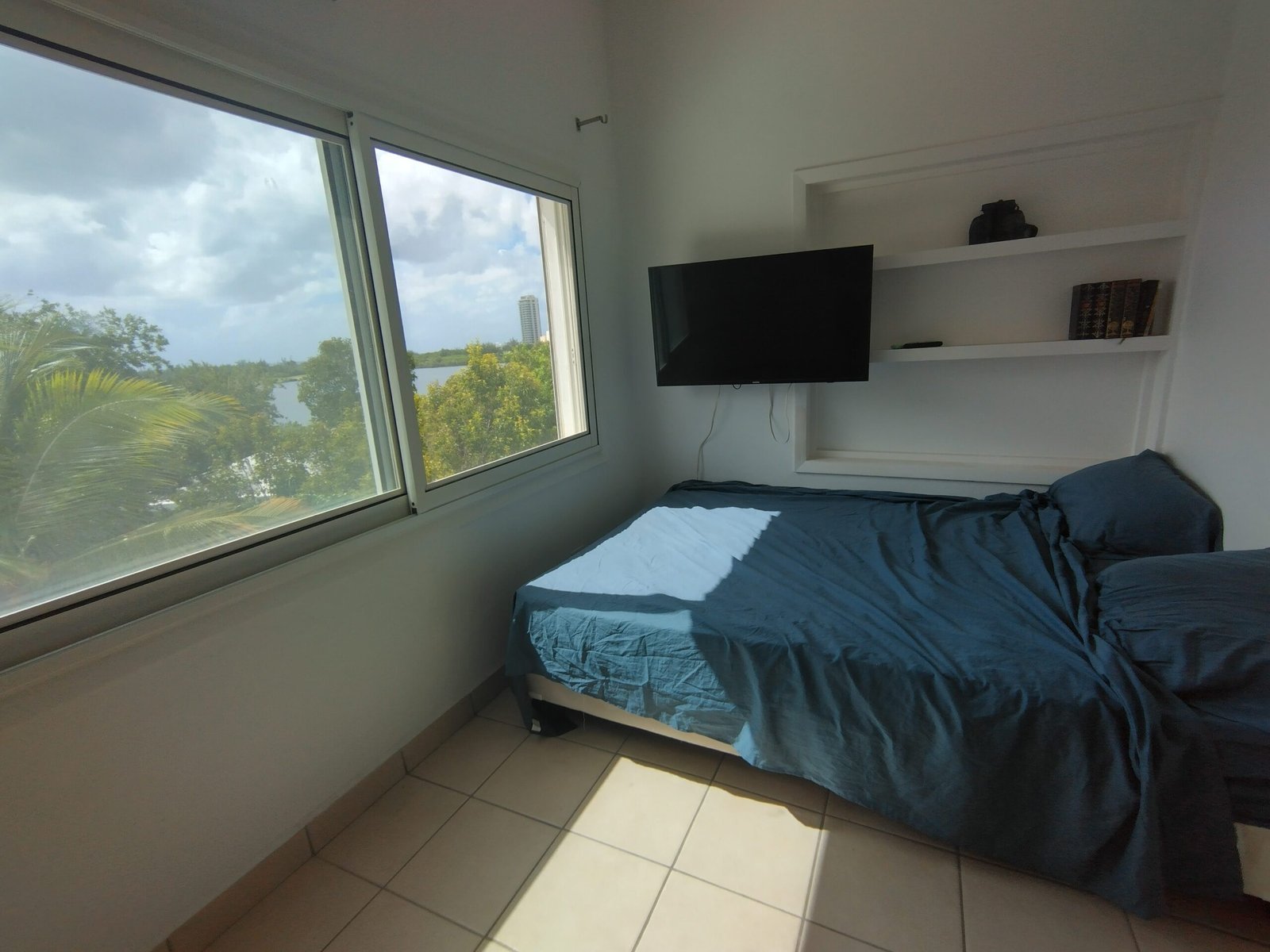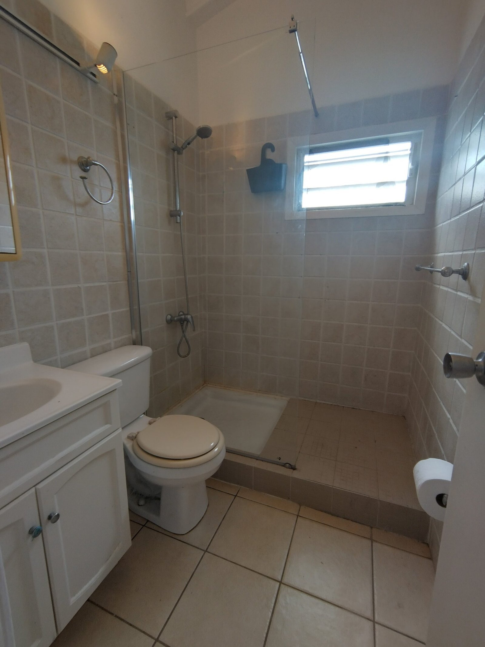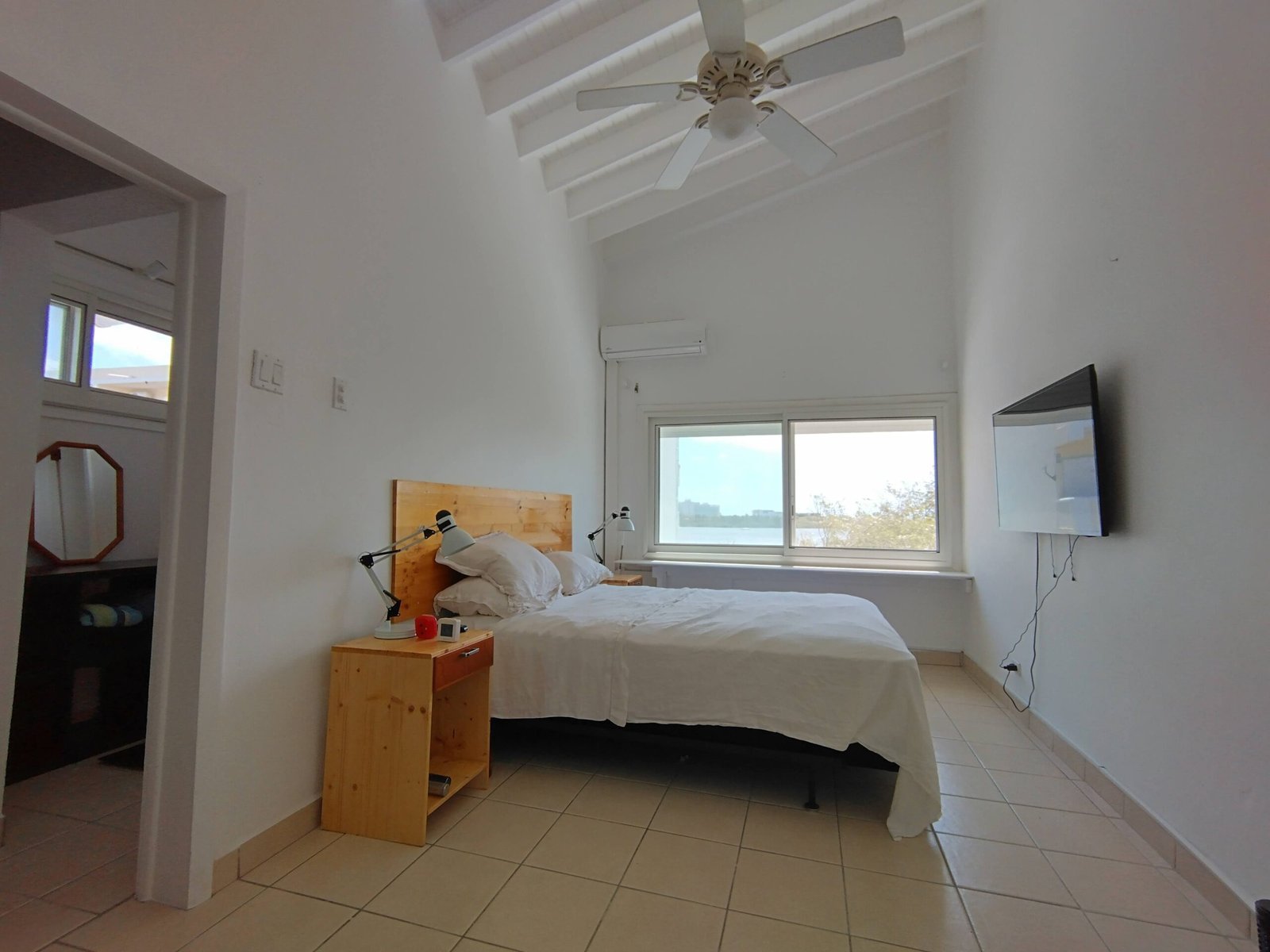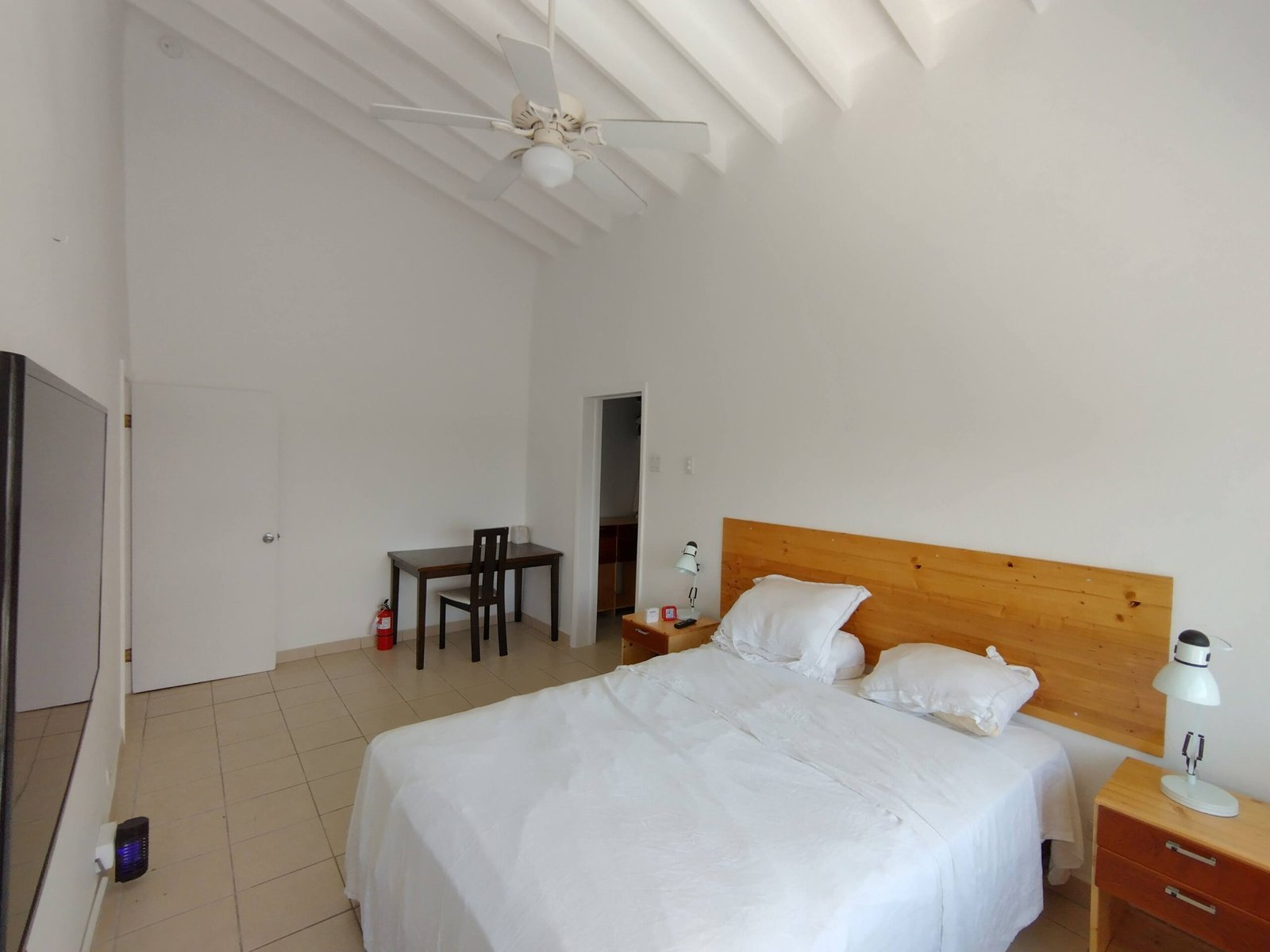 The living room is spacious and inviting, with plenty of natural light and comfort. It comes equipped with a new 75” TV, a custom bar with various glasses, a custom foldable desk, mini fridge, hurricane shutters and air conditioning.