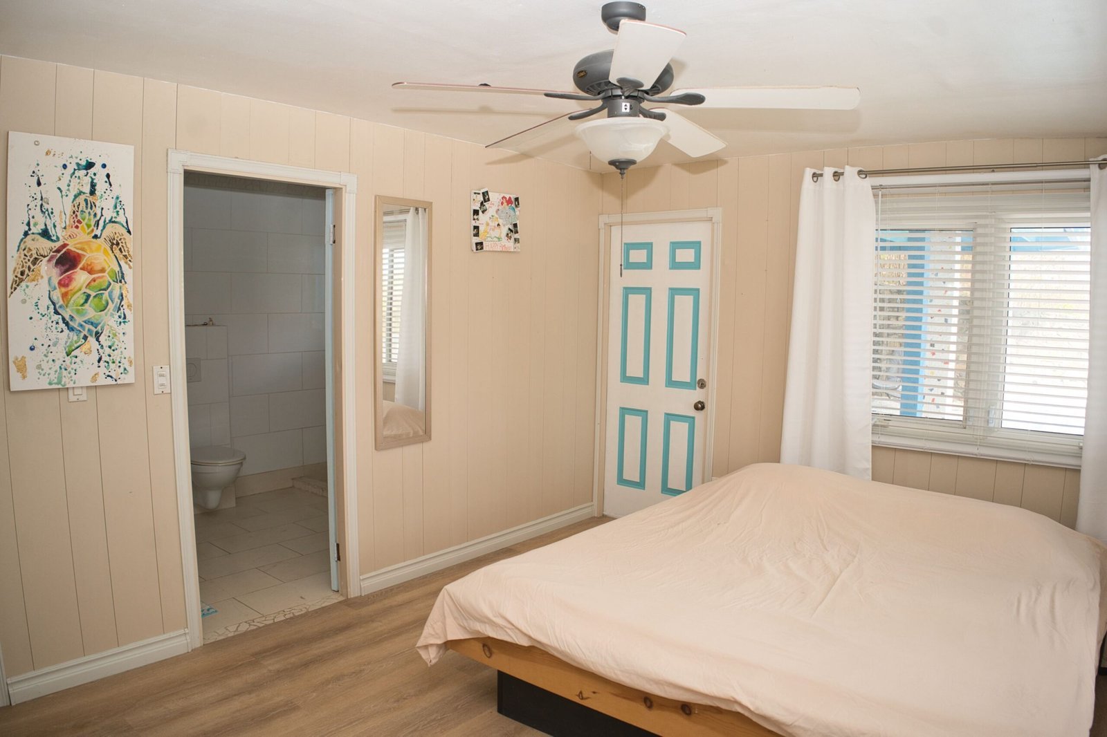 The villa features three spacious bedrooms, each designed as a private retreat. The 2 outer bedrooms have an en-suite bathroom that enters onto the covered porch.