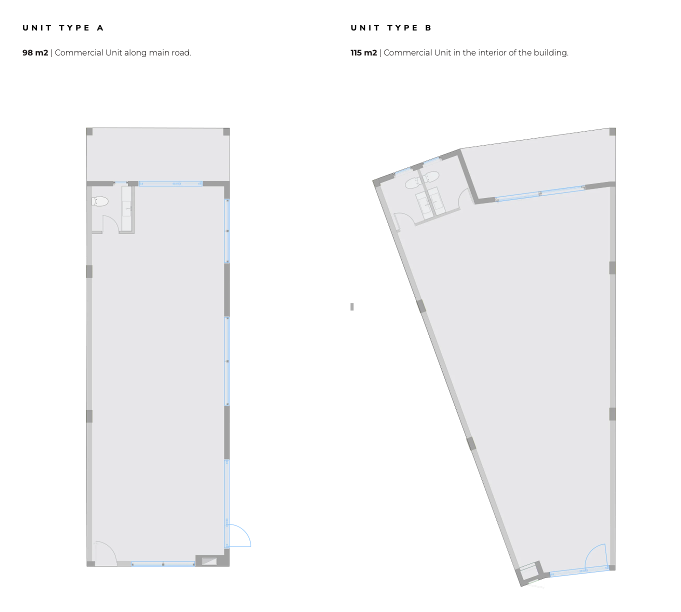 | Unit Type B | 115 m² | $465,000 | Boutique retail,a bakery, or a café. | Spacious unit in the courtyard area,features customizable interiors and shared access to outdoor seating in the beautifully landscaped courtyard area. |