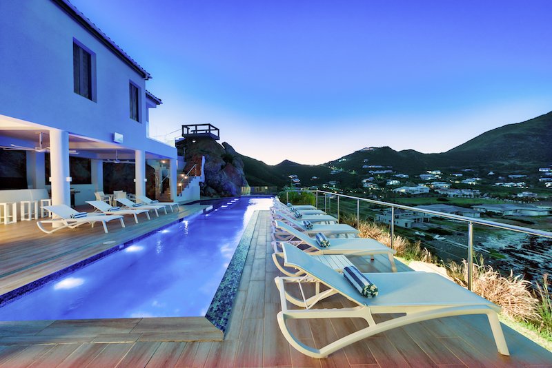 Approximately 7,000 sq. ft of air-conditioned space on an exclusive cul-de-sac in Barton Estates St. Maarten. Villa Amalia views span Guana Bay and the vast blue waters of the Caribbean ocean. In the evenings, enjoy the sparkling lights of the Villas long the shore and in the hills and passing ships.