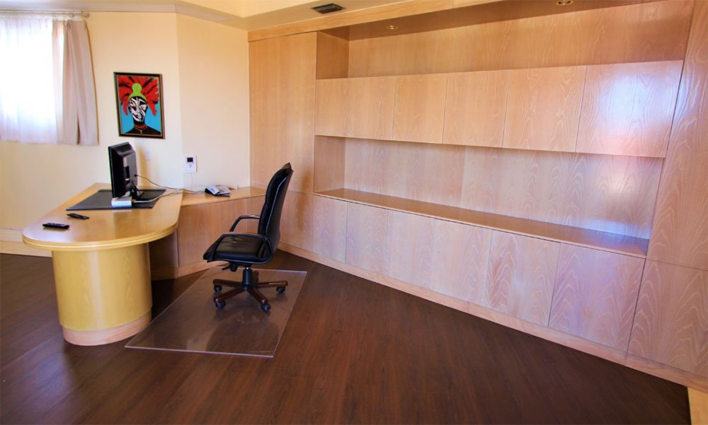 The Master Bedroom of Les Jardins de Bellevue offers an expansive and luxurious space like no other. Two king size beds, each with their own remote control to position the bed, come together to create a deluxe elevated master bed with every imaginable comfort. Soft lighting, recessed shelves and extravagant linens create a space meant for indulging. A comfort living area off the bedroom is perfect for relaxing with sumptuous furnishings. Two walk-in closets crafted with richly stained wood feature endless compartments, drawers, and racks for hanging fine garments.